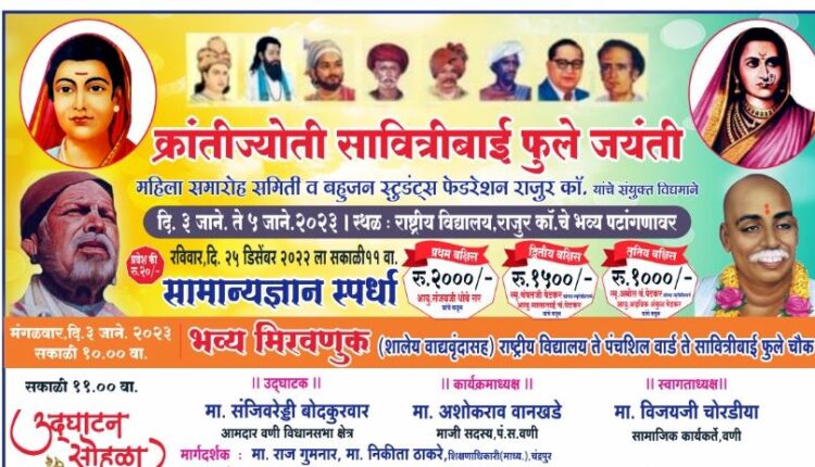 पुरुषोत्तम नवघरे, वणी: क्रांतिज्योती सावित्रीबाई फुले जयंतीनिमित्त राजूर काॅलरीत 3 ते 5 जानेवारी या काळात 3 दिवसीय कार्यक्रम होणार आहेत. महिला समारोह समिती व बहुजन स्टुडंट्स फेडरेशनचे हे आयोजन आहे. तत्पूर्वी दिनांक 25 डिसेंबरला सामान्य ज्ञान परीक्षा स्पर्धा घेण्यात आली. या स्पर्धेलाही भरभरून प्रतिसाद मिळाला.