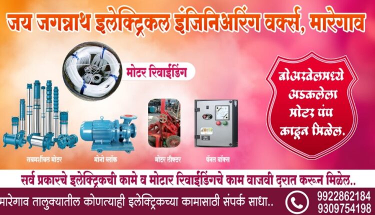 प्रतिनिधी मारेगाव: अनेकदा शेतातील बोअरवेलमध्ये रेती, दगड, केसिंग बेंड होणे इत्यादी कारणामुळे मोटर अडकते. किंवा पाईपमधून अनेकदा मोटर सुटून खाली पडते. त्यामुळे मोटर दुरुस्तीसाठी मोठी अडचण निर्माण होते व बोअरवेलचे पाणी येणे बंद होते. यासाठी आधी यवतमाळ किंवा वणी येथून टेक्निशिअन बोलवून ही समस्या सोडवली जायची. मात्र ही समस्या आता आपल्या तालुक्यातच जय जगन्नाथ इलेक्ट्रिक वर्क्स आणि मोटर रिवाईंडिंग द्वारा सोडवली जात आहे. यासाठी आपल्याला केवळ 9922862184 या क्रमांकावर एक कॉल करण्याची गरज आहे.
