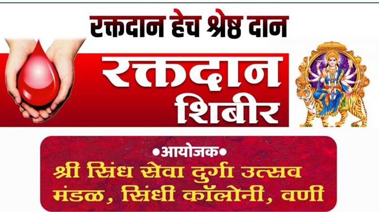 पुरुषोत्तम नवघरे, वणी: आज शनिवारी दिनांक 1 ऑक्टोबर रोजी शहरातील सिंधी कॉलोनी येथे भव्य रक्तदान शिबिराचे आयोजन करण्यात आले आहे. हे शिबिर श्री सिंध सेवा दुर्गा उत्सव मंडळाच्या वतीने आयोजित करण्यात आले आहे. या शिबिरात मोठ्या संख्येने सहभागी व्हावे असे आवाहन सन्नी तास्ना, प्रवीण फेरवाणी, कमल नागदेव यांनी केले आहे.