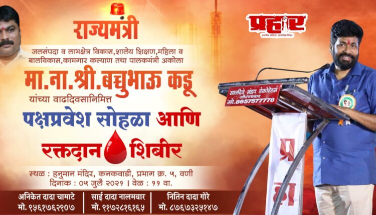 विवेक तोटेवार, वणी: राज्याचे राज्यमंत्री बच्चू कडू यांच्या वाढदिवसानिमित्त दिनांक 5 जुलै रोजी वणीत रक्तदान शिबिर व पक्षप्रवेश सोहळ्याचे आयोजन करण्यात आले आहे. सदर कार्यक्रम हा सकाळी 11 वाजता कनकवाडी येथील हनुमान मंदिर येथे आयोजित करण्यात आला आहे.