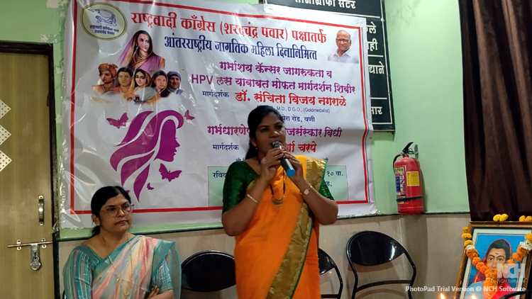 तसेच मल्टिपल प्रेग्नेंसी म्हणजे खूप वेळा बाळंतपण. हेदेखील धोकादायक असतं. असं प्रतिपादन शांतिमाला हॉस्पिटलच्या संचालिका डॉ. संचिता नगराळे यांनी केलं. राष्ट्रवादी कॉंग्रेस पार्टी (शरद पवार) द्वार नांदेपेरा रोड येथे गर्भाशयाच्या कर्करोगाची माहिती देणारे शिबिर झाले. जागतिक रया शिबिराचं आयोजन झालं. यावेळी आयुर्वेद तज्ज्ञ वैद्य सुवर्णा चरपे आरोग्यपीठावर उपस्थित होत्या. तसेच राष्ट्रवादी कॉंग्रेस पार्टी (शरद पवार)चे प्रदेश सरचिटणीस विजय नगराळे, वणी तालुका विधानसभा अध्यक्ष सूर्यकांत खाडे यांच्या नेतृत्वात होत असलेल्या या शिबिराची माहिती दिली. यावेळी सामाजिक कार्यकर्ते तथा पत्रकार दिलीप भोयर उपस्थित होते..