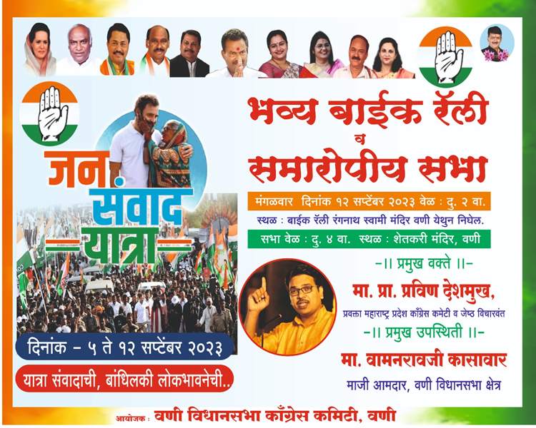 वणी येथे सकाळी 2 वाजता रंगनाथ स्वामी मंदिरातून बाईक रॅली निघणार आहे. चिखलगाव, गणेशपूर या गावात पोहोचल्यानंतर दु. 4 वाजता या रॅलीचा शेतकरी मंदिरात समारोप होणार आहे. त्यानंतर शेतकरी मंदिरातच समारोपीय सभा होणार आहे. बाईक रॅली व समारोपीय कार्यक्रमाला मोठ्या संख्येने उपस्थित राहावे असे आवाहन वणी विधानसभा क्षेत्रातील काँग्रेस पदाधिकारी व कार्यकर्त्यांनी केले आहे.