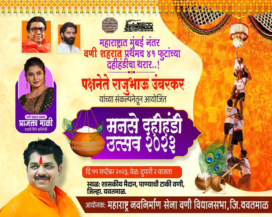 जितेंद्र कोठारी, वणी: कृष्ण जन्माष्टमी पासून संपूर्ण राज्यात दहीहंडी उत्सव जल्लोषात साजरा करण्यात येत आहे. मोठ्या शहरांसोबतच आता ग्रामीण भागातही दहीहंडी फोडण्याची प्रथा सुरू झाली आहे. महाराष्ट्र नवनिर्माण सेनेतर्फे वणी येथे पहिल्यांदा भव्य दहीहंडी उत्सवाचे आयोजन करण्यात आले आहे. शासकीय मैदानावर 11 सप्टेंबर रोजी दहीहंडीचा थरार वणीकर नागरिकांना अनुभवायला मिळणार आहे. या कार्यक्रमात सुप्रसिद्ध अभिनेंती प्राजक्ता माळी यांची प्रमुख उपस्थिती राहणार आहे. दहीहंडी उत्सवासाठी मनसेकडून जय्यत तयारी करण्यात आली आहे. आज झालेल्या पत्रकार परिषदेत मनसे नेते राजू उंबरकर यांनी याबाबत मीडियाला माहिती दिली.
