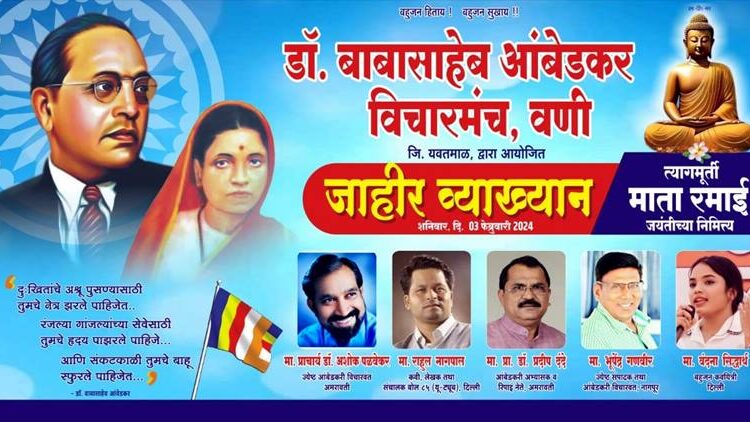 पुरुषोत्तम नवघरे, वणी:आज शनिवारी दिनांक 3 फेब्रुवारी संध्याकाळी 5 वाजता शेतकरी मंदिर लॉन येथे जाहीर व्याख्यान आयोजित करण्यात आले आहे. या कार्यक्रमाचे अध्यक्ष जेष्ठ आंबेडकरी विचारवंत प्राचार्य डॉ. अशोक पळवेकर राहणार आहे. दिल्ली येथील कवि आणि लेखक राहुल नागपाल हे याची या कार्यक्रमाला प्रमुख उपस्थिती राहणार आहे. अमरावती येथील डॉ. प्रदीप दंदे हे आंबेडकरी राजकीय चळवळीवर आपले विचार मांडणार आहेत. तर नागपूर येथील भूपेंद्र गणवीर हे लोककल्याणकारी राज्य या विषयावर आपले विचार मांडणार आहेत. दिल्लीतील कवयित्री वंदना सिद्धार्थ या आपल्या कविता सादर करणार आहेत. सदर कार्यक्रम हा माता रमाई जयंती निमित्त डॉ. बाबासाहेब आंबेडकर विचारवंच, वणी तर्फे आयोजित करण्यात आला आहे. या कार्यक्रमाला मोठ्या संख्येने हजेरी लावावी असे आवाहन आयोजकांतर्फे करण्यात आले आहे.