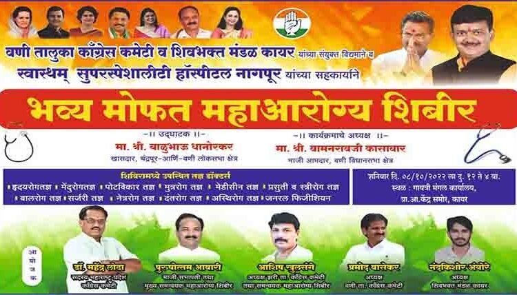 महाआरोग्य शिबिरानिमित्त खासदार बाळूभाऊ धानोरकर व माजी आमदार वामनराव कासावार यांच्या प्रमुख उपस्थितीत कायर परिसरातील अनेक गावातील हजारो युवा शनिवार 8 ऑक्टो. रोजी कॉंग्रेस पक्षात प्रवेश घेणार असल्याची माहिती डॉ. महेंद्र लोढा यांनी दिली आहे.