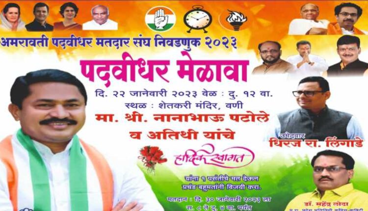 जितेंद्र कोठारी, वणी : महाराष्ट्र विधान परिषदेच्या पदवीधर आणि शिक्षक मतदारसंघाची निवडणूक जाहीर झाली आहे. अमरावती पदवीधर मतदारसंघातून महविकास आघाडीतर्फे धीरज लिंगाडे यांना उमेदवारी देण्यात आली आहे. धीरज लींगाडे यांच्या समर्थनार्थ रविवार 22 जानेवारी रोजी दुपारी 12 वाजता येथील शेतकरी मंदिरात पदवीधर मेळाव्याचे आयोजन करण्यात आले आहे. या मेळाव्यात काँग्रेस प्रदेशाध्यक्ष नानाभाऊ पटोले, खासदार बाळुभाऊ धानोरकर, माजी आमदार वामनराव कासावार, माजी आमदार विश्वास नांदेकर हे प्रामुख्याने उपस्थित राहणार आहेत.