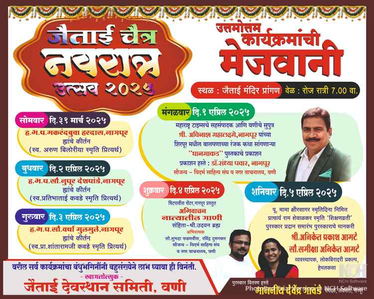 पुरुषोत्तम नवघरे, वणी: शहराची ग्रामदेवता म्हणजे जैताई. इथला अश्विन आणि चैत्र नवरात्रौत्सव संपूर्ण महाराष्ट्राला परिचित आहे. दोन्ही नवरात्रांत विविध उपक्रम आणि कार्यक्रमांची भरगच्च मेजवानी असते. इथल बहुप्रतीक्षित चैत्र नवरात्रौत्सव सोमवार दिनांक 31 मार्च ते 5 एप्रिलपर्यंत होत आहेत. हे सर्व कार्यक्रम रोज सायंकाळी 7 वाजता जैताई मंदिराच्या प्रांगणात होतील.