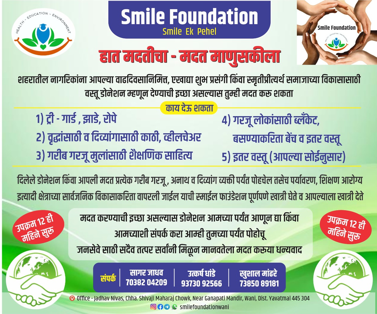लॉकडाऊनपासून विविध सामाजिक उपक्रमात अग्रेसर असलेल्या स्माईल फाउंडेशनद्वारा आता ‘हात मदतीचा, मदत माणूसकीला’ उपक्रमाला सुरूवात झाली आहे. हा उपक्रम लोकसहभागातून व लोकांच्या मदतीतून चालणार आहे. या उपक्रमात ज्यांच्याकडे रोपटे, बिया, जुने ब्लँकेट, नवीन कपडे, स्वेटर, सायकल, पु्स्तके, खेळणे इत्यादी वस्तू लोकांकडून गोळा करून त्या गरजुंपर्यंत पोहोचवल्या जाणार आहे. याशिवाय इच्छुकांना यात नवीन वस्तूही दान करता येणार आहे. शुभप्रसंगी, वाढदिवस, स्मृती प्रित्यर्थ इत्यादी दिवशीही विशेष कार्यक्रमाद्वारे हा उपक्रम राबवला जाणार आहे.