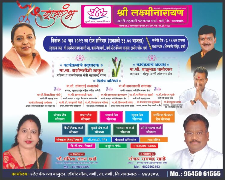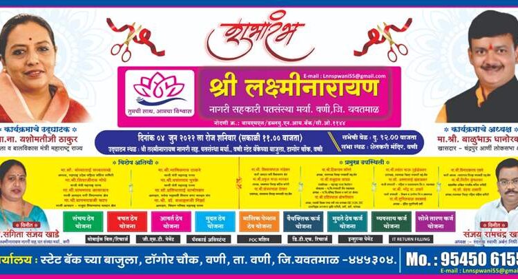 जितेंद्र कोठारी, वणी: येथील रंगनाथस्वामी अर्बन निधी लिमिटेडच्या प्रचंड यशानंतर आता वणीकरांच्या सेवेत श्री लक्ष्मीनारायण नागरी सहकारी पतसंस्था सुरू करण्यात येत आहे. या पतसंस्थेचे कार्यालय टागोर चौकातील स्टेट बँकेच्या बाजूला उघडण्यात आले आहे. या पतसंस्थेचा उद्घाटन सोहळा शनिवार 4 जून रोजी सकाळी 11 वाजता पार पडणार आहे. उद्घाटनपर सभा येथील शेतकरी मंदिरात आयोजित केली आहे.