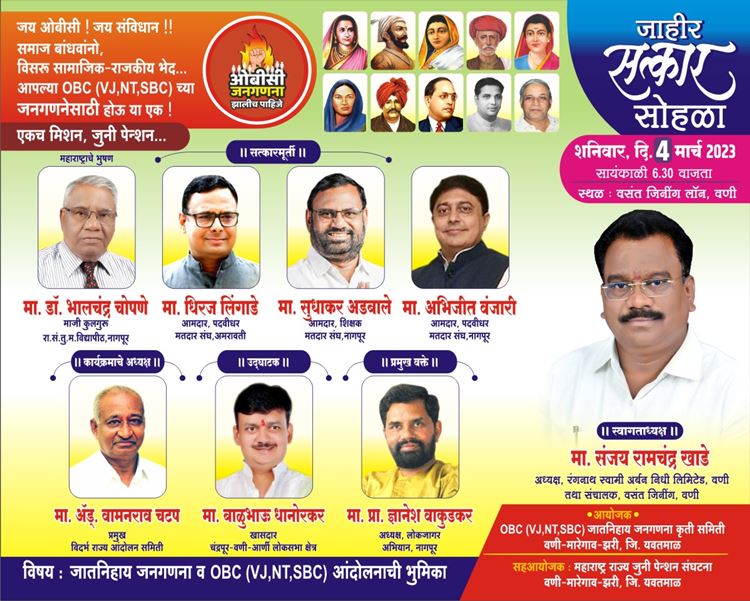 माजी कुलगुरु भालचंद्र चोपणे यांचा कार्यक्रमात जाहीर सत्कार केला जाणार आहे. याशिवाय नवनिर्वाचित विधानसभा आमदार सुधाकर अडबाले, धीरज लिंगाडे व अभिजीत वंजारी यांचा देखील सत्कार केला जाणार आहे. ओबीसी जनगणना कृती समिती व महाराष्ट्र राज्य जुनी पेन्शन संघटना यांच्या संयुक्त विद्यमाने या कार्यक्रमाचे आयोजन करण्यात आले आहे.