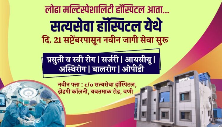 विवेक तोटेवार, वणी: वणीतील तेली फैल येथील लोढा मल्टिस्पेशालिटी हॉस्पिटल सोमवार दिनांक 21 सप्टेंबरपासून सत्यसेवा हॉस्पिटल झेड पी कॉलनी यवतमाळ रोड येथे स्थलांतर होत आहे. त्यामुळे रुग्णांनी आता नवीन ठिकाणी संपर्क साधावा असे आवाहन लोढा हॉस्पिटलतर्फे करण्यात आले आहे.