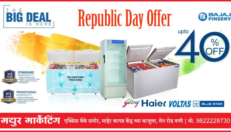 सुरेश पाचभाई, वणी: शहरातील इलेक्ट्रॉनिक्स वस्तूंच्या विक्रीसाठी प्रसिद्ध असलेल्या मयूर मार्केटिंग (सोनी शोरुम) येथे 26 जानेवारी निमित्त ग्राहकांसाठी खास ‘रिपब्लिक डे’ ऑफर लॉन्च करण्यात आली आहे. या ऑफरचे प्रमुख आकर्षण एसी व फ्रिजर ठरत आहे. या ऑफरमध्ये ग्राहकांना ब्रँडेड एसी व फ्रिजरवर 40 टक्यापर्यंतची घसघशीत सुट दिली जात आहे. सोबतच इन्स्टॉलेशन व स्टँड देखील मिळणार आहे. यात 10 वर्षांच्या वॉरंटीचा आणि 10 टक्के कॅशबॅकचाही समावेश आहे. सोनीच्या होम थिएटरवर 12 हजार पर्यंतचे डिस्काउंट दिले जाणार आहे. यावाय इतर इलेक्ट्रॉनिक्स वस्तूंवरही 30 टक्यांपर्यंत सुट आहे. याशिवाय इतर वस्तूंही ऑनलाईन पेक्षा कमी दरात उपलब्ध करून दिल्या जात आहे. ही ऑफर केवळ रविवार पर्यंत असल्याने ग्राहकांनी त्वरित याचा फायदा घेऊन मोठी बचत करावी असे आवाहन मयूर मार्केटिंग तर्फे करण्यात आले आहे.