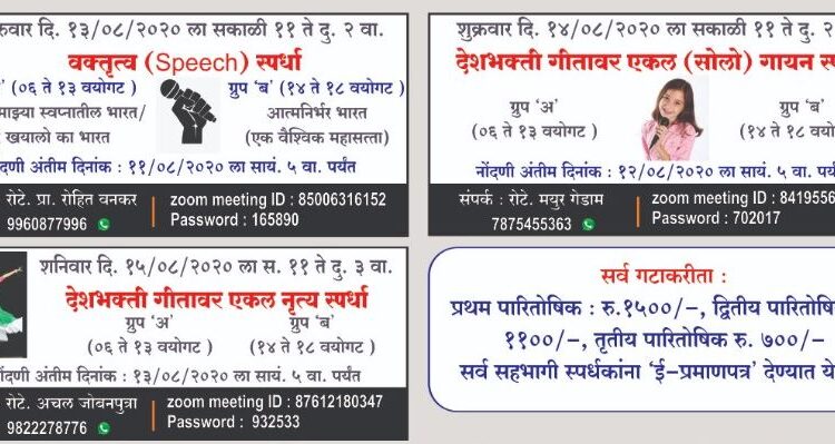 दिनांक 13 ऑगस्ट रोजी स. 11 ते दु 2 पर्यंत वक्तृत्व सर्धा आयोजिक करण्यात आली आहे. दिनांक 14 ऑगस्ट रोजी स. 11 ते दु. 2 पर्यंत देशभक्तीपर एकल गायन स्पर्धा आयोजित करण्यात आली आहे. 15 ऑगस्ट रोजी स.11 ते दु. 3 पर्यंत देशभक्ती गितावर एकल नृत्यू स्पर्धा आहे. ही स्पर्धा दोन गटात आहे. अ गट हा 06 ते 13 वयोगटासाठी आहे. तर गट ब हा 14 ते 18 वयोगटासाठी आहे.