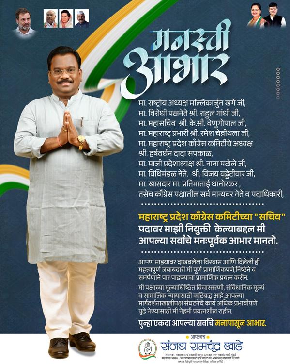 पक्षाने मोठी जबाबदारी दिल्याबद्दल मनापासून आभार. आजच्या यादीतून पक्ष नेहमी खऱ्या कार्यकर्त्यांची दखल घेतो, हेच पक्षाने दाखवले. मला सोपवलेल्या सचिवपदाची जबाबदारी आमचे प्रदेशाध्यक्ष हर्षवर्धन सपकाळ यांच्या नेतृत्वाखाली सक्षमपणे पार पाडण्याचा प्रयत्न करेन. काँग्रेसचे विचार आणि काम तळागाळापर्यंत पोहोचवण्याचा प्रयत्न करेन. तसेच स्थानिक पातळीवर पक्ष वाढीसाठी कायम प्रयत्नशील राहणार याचे मी वचन देतो. – संजय खाडे, प्रदेश सचिव काँग्रेस
