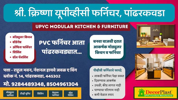 पांढरकवडा: पांढरकवडा व परिसरात पीव्हीसी व यूपीव्हीसी फर्निचरसाठी प्रसिद्ध असलेल्या श्री क्रिष्णा यूपीव्हीसी फर्निचर येथे नवीन वर्षा निमित्त विशेष ऑफर सुरु करण्यात आली आहे. त्यात ग्राहकांना अवघ्या 35 हजारात 10 फूट किचन विद ट्रॉली तयार करता येणार आहे. सोबत यावर क्रॉकरी बॉक्स मोफत मिळणार आहे. ही ऑफर केवळ दसरा व त्यानंतर केवळ चार दिवसांपर्यंत सुरु राहणार आहे. त्यामुळे ग्राहकांनी राहुल भवन, नॅशनल हायवे जवळ, ए विंग, ब्लॉक नंबर 14 येथील क्रिष्णा यूपीव्हीसी फर्निचर येथे भेट द्यावी. येते आपल्याला पीव्हीसी फर्निचरचा डेमो पाहता येईल. तसेच आवडल्यास आपल्याला मॉड्युलर किचन, टीव्ही युनिट, बेडरूम फर्निचर, वॉल पॅलिंग इत्यादी फर्निचर देखील बनवता येईल. त्यामुळे एकदा दुकानात अवश्य भेट द्यावी, किंवा 9284489348 किंवा 8504961304 या क्रमांकावर संपर्क साधावा, असे आवाहन संचालकांतर्फे करण्यात आले आहे.