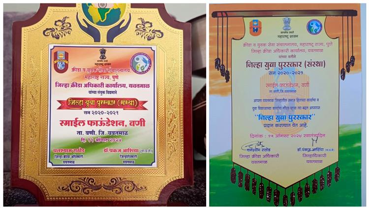 त्यांच्या या कार्याची क्रीडा व युवक कल्याण संचलनालय, जिल्हा क्रीडा अधिकारी कार्यालय यांनी दखल घेत स्माईल फाउंडेशनचा स्वातंत्र्य दिनी सन्मान करण्यात आला. जिल्हाधिकारी कार्यलयात झालेल्या सोहळ्यात पालकमंत्री संजय राठोड यांच्या हस्ते तसेच जिल्हाधिकारी डॉ. पंकज आशिया, जिल्हा क्रीडा अधिकारी घनश्याम राठोड व जिल्हा पोलीस अधिक्षक यांच्या प्रमुख उपस्थितीत हा पुरस्कार प्रदान करण्यात आला. यावेळी स्माईल फाउंडेशनच्या पुष्पा जाधव, अर्चना पिदुरकर, रोहित ओझा, गौरव कोरडे, श्री हिंगे यांची उपस्थिती होती.