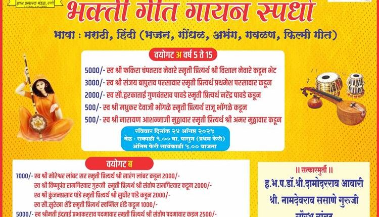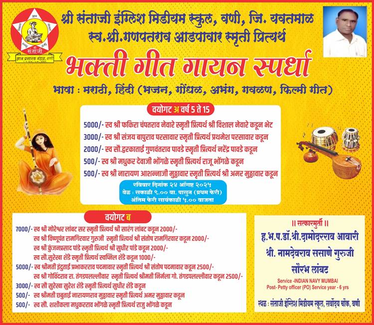 विवेक तोटेवार, वणी: स्वर्गीय गणपतराव आडपावार यांच्या स्मृती प्रित्यर्थ रविवार, दि. 24 ऑगस्ट रोजी दुपारी 3 ते 8 वाजेपर्यंत संताजी इंग्लिश मिडीयम स्कूल, वणी येथे गीत गायन स्पर्धेचे आयोजन करण्यात आले आहे. या स्पर्धेत मराठी आणि हिंदी भाषेतील भजन, गोंधळ, गवळण, अभंग आणि सिनेमातील गीते गाण्याची संधी स्पर्धकांना मिळणार आहे. ही स्पर्धा दोन गटात विभागली असून यातील एक गट हा 5 ते 15 व दुसरा गट 16 ते अधिक असा आहे. या स्पर्धकांसाठी स्मृतिचिन्ह व रोख अशा स्वरूपाचे बक्षीस देण्यात येणार आहे. स्पर्धकांना स्मृतिचिन्ह व रोख देऊन गौरविण्यात येणार आहे. या स्पर्धेत मोठ्या संख्येने सहभागी व्हावे, असे आवाहन करण्यात आयोजकांतर्फे करण्यात आले आहे.