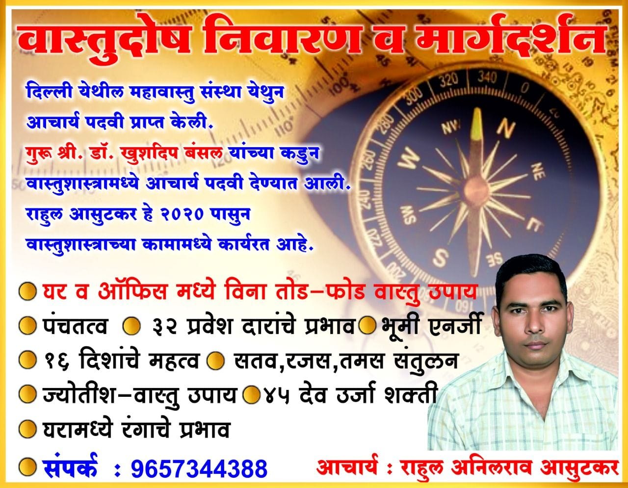 घर, ऑफिस इत्यादी मध्ये वास्तूदोष जाणवत असल्यास यावर आचार्य राहुल आसुटकर हे वास्तूच्या विना तोडफोड मार्गदर्शन करणार आहेत. याशिवाय नवीन घर बांधणे असल्यास यातही ते मार्गदर्शन करणार आहेत. पंचतत्व, 32 दारांचे प्रभाव, भूमी एनर्जी, दिशांचे महत्त्व, रजस, सतव, तमस संतूलन, घरातील रंग यावरही ते मार्गदर्शन करता. मार्गदर्शन व निवारणासाठी इच्छुकांनी संपर्क साधावा. अधिक माहितीसाठी संपर्क – 9657344388