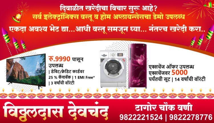 सुरेश पाचभाई: खरेदी शिवाय दिवाळी अपूर्णच आहे. दिवाळीत इलेक्ट्रॉनिक्स वस्तू आणि होम अप्लायन्सेसची ग्राहक मोठ्या प्रमाणात खरेदी करतात. मात्र अपु-या माहितीमुळे अनेकदा ग्राहकांची फसगतही होते. त्यामुळे वणीत टागोर चौक येथील विठ्ठलदास देवचंद या प्रतिष्ठाणमध्ये इलेक्ट्रॉनिक्स वस्तू आणि होम अप्लायन्सेसच्या खरेदीसाठी ग्राहकांना डेमो सुविधा उपलब्ध करून देण्यात आली आहे. यात ग्राहकांना टीव्ही, फ्रिज, वॉशिंग मशिन, एसी, लॅपटॉप, व्हॅक्यूम क्लिनर इत्यादी वस्तूंच्या डेमो बघता येणार आहे. डेमो मुळे ग्राहकांना नेमकी कोणती वस्तू घ्यावी? वस्तू कशी काम करते? इत्यादी माहिती मिळते. या सुविधेचा ग्राहकांनी लाभ घ्यावा असे आवाहन करण्यात आले आहे.