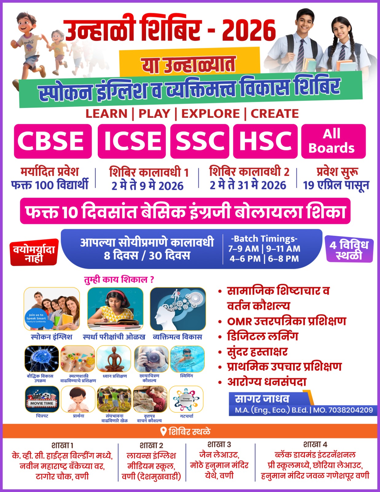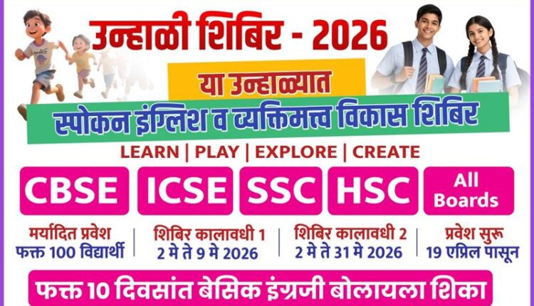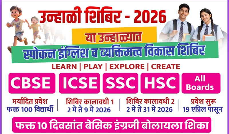 बहुगुणी डेस्क, वणी: इंग्रजी वाचता-लिहिता येत असूनही प्रभावी संवाद साधताना अनेकांना अडचणी येतात. यावर मात करण्यासाठी सराव व योग्य वातावरणाची गरज लक्षात घेऊन वणी येथे “उन्हाळी शिबिर 2026” अंतर्गत स्पोकन इंग्लिश व व्यक्तिमत्व विकास शिबिराचे आयोजन करण्यात आले आहे. इयत्ता 3रीपासून पोस्ट ग्रॅज्युएटपर्यंतचे विद्यार्थी, स्पर्धा परीक्षांची तयारी करणारे, गृहिणी, व्यावसायिक व नोकरदार यांच्यासाठी हे शिबिर उपयुक्त ठरणार आहे. “Learn | Play | Explore | Create” या संकल्पनेवर आधारित शिबिर सर्वांगीण विकासावर भर देणार आहे.नोंदणी १९ एप्रिलपासून सुरू झाली असून २ मेपर्यंत 7038204209 या क्रमांकावर करता येईल.