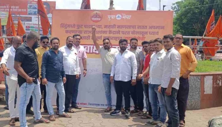 जितेंद्र कोठारी, वणी : हिंदूंमध्ये फूट पाडणाऱ्या आणि मराठी माणसाचा अपमान करणाऱ्या महाराष्ट्राच्या राज्यपालाना केंद्र सरकारने परत बोलावून घ्यावे. या मागणीला घेऊन युवासेनातर्फे 31 जुलै रोजी वणी येथे स्वाक्षरी मोहीम राबविण्यात आली. येथील टिळक चौकात दुपारी 12.30 वाजता युवासेना कार्यकर्त्यांनी राज्यपाल भगतसिंग कोश्यारी यांनी मराठी माणसाला अपमानित करणाऱ्या व्यक्तव्याचे निषेध केले.